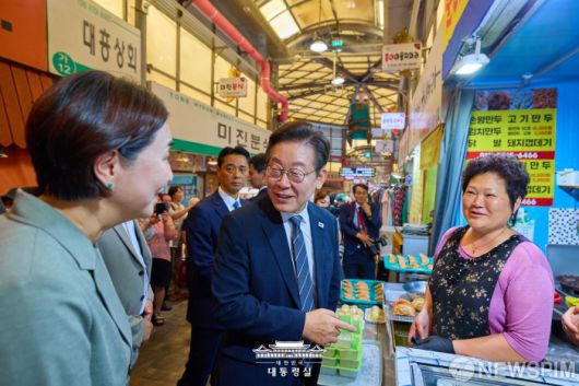 [서울=뉴스핌] 이재명 대통령이 5일 인천 미추홀구 용현시장을 찾아 시민들과 인사를 나누고 있다. [사진=대통령실] 2025.09.05 photo@newspim.com