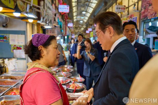 [서울=뉴스핌] 이재명 대통령이 5일 인천 미추홀구 용현시장을 찾아 상인들과 대화를 나누고 있다. [사진=대통령실] 2025.09.05 photo@newspim.com