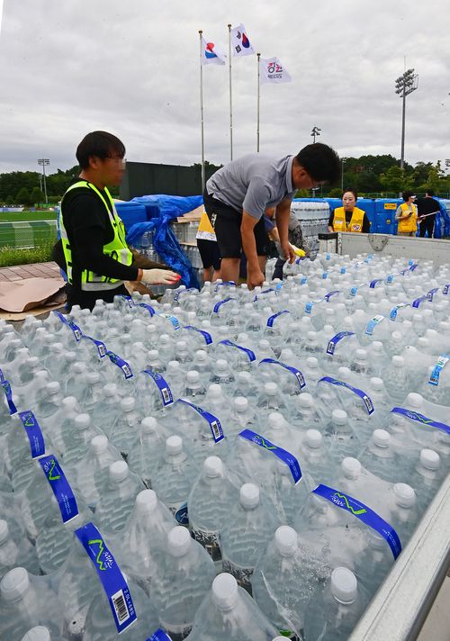 5일 강원 강릉시 강남동 강남축구공원에서 주민들에게 생수를 나눠주고 있다. [연합뉴스] |