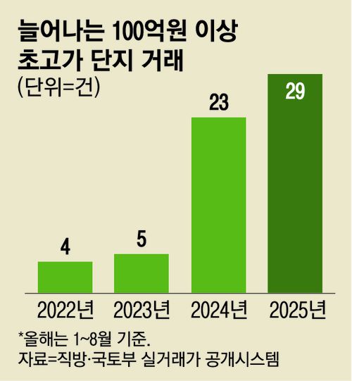 5일 부동산 플랫폼 직방이 국토교통부 실거래가 공개시스템을 분석한 결과, 올해 1~8월 서울에서 체결된 100억원 이상 아파트 매매 거래는 총 29건으로 집계됐다. 아직 연말이 아닌데도 지난해 거래 건수(23건)를 훌쩍 넘어선 것이다. 역대 최대로 많은 거래 수치이기도 하다. 100억원 이상 초고가 단지 거래는 2022년엔 4건, 2023년엔 5건뿐이었다.