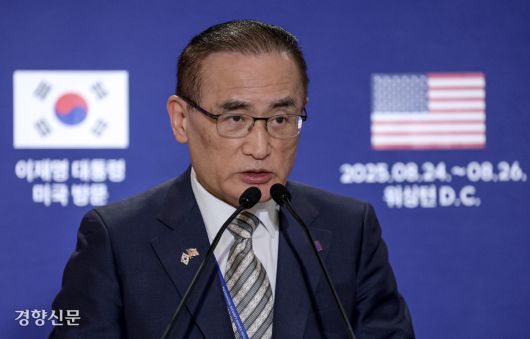 위성락 국가안보실장이 지난달 25일(현지시간) 미국 워싱턴DC의 한 호텔에서 한·미 정상회담 브리핑을 하고 있다. 김창길 기자 |