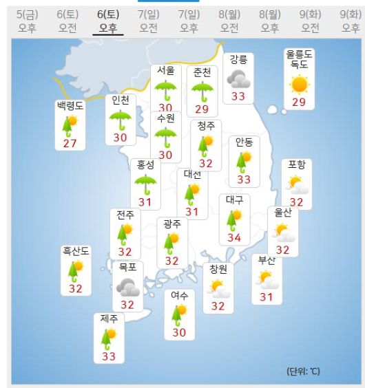 서쪽 지역을 중심으로 최대 시간당 50mm 안팎의 매우 강한 비가 내리겠다. 토요일에는 서풍이 불면서 온난다습한 공기가 유입되어 무덥고 습한 날씨가 이어지겠고, 7일 일요일, 차고 건조한 공기가 남하하여 기온이 일시적으로 낮아지는 곳이 있겠다.