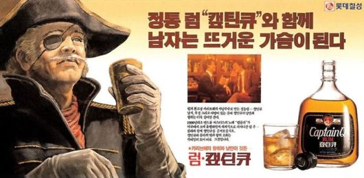 ‘캡틴큐’ 광고. 초기 표기는 ‘캪틴큐’였다. 1980년 출시 첫해 1000만병이 팔리며 큰 인기를 끌었다. 하지만 프리미엄 양주의 등장 이후 존재감이 사라졌고 2015년 단종됐다. /명욱 제공 |