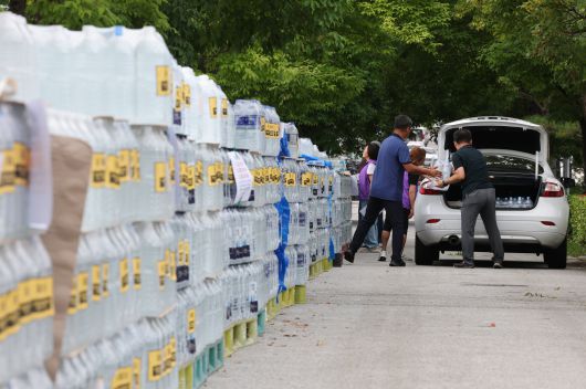5일 강원 강릉시 포남2동 주민센터 근처에서 자원봉사자들이 시민들에게 생수를 나눠주고 있다. 차에 실어 가기 좋도록 ‘드라이브스루’ 방식으로 생수를 배급했다./장경식 기자 |