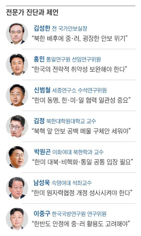 신범철 세종연구소 수석연구위원은 “중국·러시아와의 관계 강화로 북한이 대륙간탄도미사일 발사 시험이나 전술 핵실험을 한다 해도 새로운 유엔 대북 제재를 받지 않게 됐다”며 “한국이 한·미 동맹과 한·미·일 협력을 일관되게 견지하면서 연합 훈련 지속 등을 통해 안정적 관계를 보여주는 것이 (대북 억제에) 중요하다”고 했다.