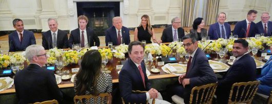 빅테크 불러 “투자” 다그친 트럼프 4일(현지 시간) 미국 워싱턴 백악관 국빈만찬장에서 도널드 트럼프 미국 대통령 초청으로 모인 빅테크 기업 수장들이 대화를 나누고 있다. 메타 마이크로소프트 애플 구글 등 인공지능(AI) 분야 빅테크의 창업자와 최고경영자(CEO)들이 참석한 이날 행사에서 트럼프 대통령은 미국 내 투자를 확대하라고 요구했고, 참석자들은 대규모 투자를 약속했다. 사실상 미국 빅테크에 투자 압박을 가하는 게 목적이었던 행사란 평가가 나온다. 워싱턴=AP 뉴시스 |