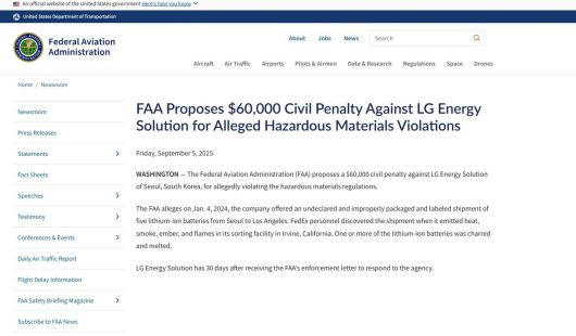 LG에너지솔루션에 과태료를 부과한다는 보도자료 형식의 게시글(미 연방항공청(FAA) 웹사이트 갈무리) |
