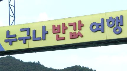 지역으로 진입하는 도로 입구에 '반값 여행'이라는 안내 글귀가 눈에 띕니다.