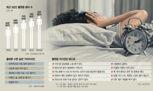 5일 건강보험심사평가원에 따르면 최근 5년간 불면증 환자 수는 2020년 65만 8675명에서 2024년 76만 8814명으로 17% 증가했다. 수면제 처방량과 처방 환자 수도 늘었다. 서울대병원·서울의대 공동 연구팀이 최근 발표한 자료에 따르면 수면제 총 처방 건수는 2010년 1050만 건에서 2020년 3850만 건, 2021년 4120만 건, 2022년 4240만 건으로 12년 사이 4배 이상 늘었다. 특히 코로나19 팬데믹이 국내 불면증 환자의 수면제 사용을 크게 늘린 것으로 분석됐다. 병원 진료를 받지 않은 경우까지 합치면 불면증 환자는 훨씬 더 많을 것으로 추정된다.