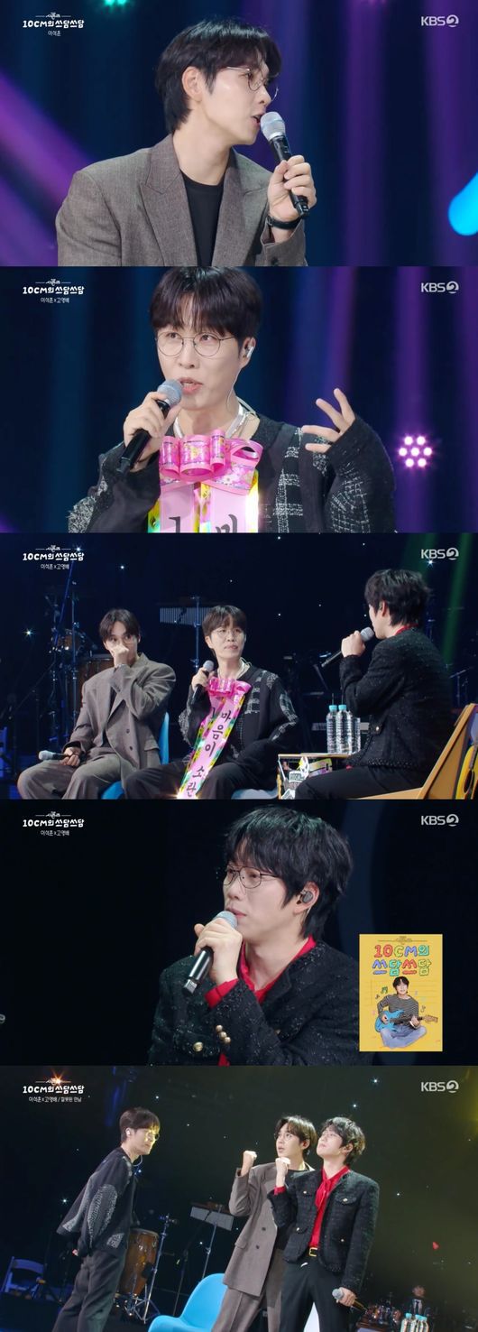 그런가 하면 고영배는 '10CM가 MC라니 마음이 소란스럽다'라고 적힌 화환띠를 목에 두르고 '인간 화환'이 돼 등장했다. 그는 "제가 분명히 박보검 님 마지막 회차에 아이유 님 등장한 것처럼 하고 싶다고 말씀드렸다. 그런데 이렇게 해주셨다"라고 해명하며 웃음을 자아냈다.