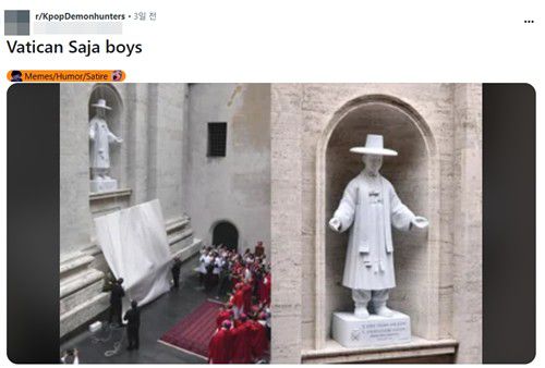 이런 가운데 지난달 25일 해외 온라인 커뮤니티 레딧에는 '바티칸 사자 보이즈'(Vatican Saja boys)라는 문구와 함께 이탈리아 로마 바티칸 성당에 세워진 김대건 신부 성상 사진이 올라오기도 했다.