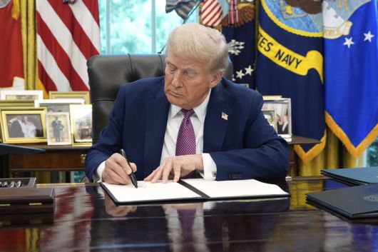 [워싱턴=AP/뉴시스]도널드 트럼프 미 대통령이 5일(현지시각) 미국인 구금, 인질을 막기 위한 '불법 구금 후원국' 지정 행정명령에 서명하고 있다. 2025.9.6. |