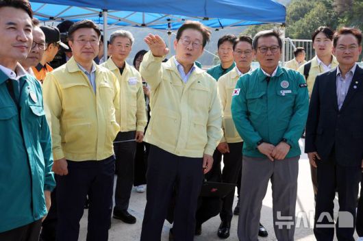 [강릉=뉴시스] 고범준 기자 = 이재명 대통령이 30일 강원 강릉시 성산면 오봉저수지를 방문해 가뭄 피해 상황 등을 점검하고 있다. 2025.08.30. bjko@newsis.com |