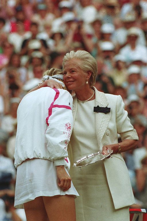 1993년 영국 윔블던 테니스 대회 여자 결승전에 진출한 야나 노보트나(체코) 선수가 준우승에 그친 뒤 오열하자 영국 왕실 구성원인 켄트 공작 부인 캐서린(오른쪽)이 직접 다가가 어깨를 껴안으며 위로하고 있다. |