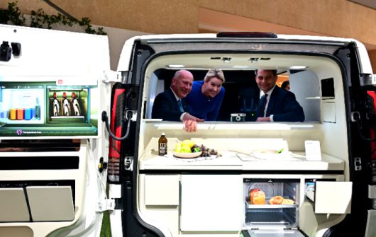 베를린 시장 카이 베그너(왼쪽 첫번째), 베를린 부시장 겸 경제에너지당국 의원 프란치스카 기파이(왼쪽 두번째) 등이 LG전자의 AI 모빌리티 공간 솔루션 '슈필라움'을 체험해보고 있다. LG전자 제공 |