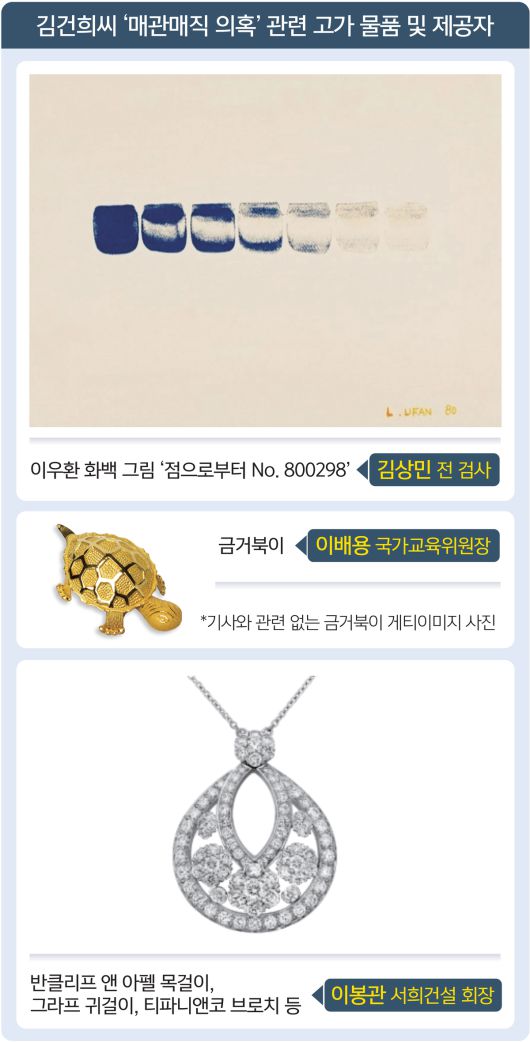 김씨의 모친 최은순씨의 압수수색 과정에서 나온 10돈짜리 ‘금거북이’의 공여자는 이배용 국가교육위원장으로 지목됐다. 금고에서 금거북이와 함께 이 위원장이 윤 전 대통령에게 쓴 것으로 보이는 ‘편지’가 결정적 단서였다.