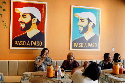 지난달 엘살바도르 수도 산살바도르의 한 카페에서 시민들이 휴식을 취하고 있다. 벽에는 '한 단계씩(paso a paso)'이라는 표현과 함께 나이브 부켈레 대통령의 그림이 보인다. /로이터 연합뉴스 |
