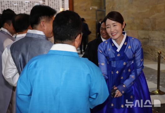 [서울=뉴시스] 김명년 기자 = 강선우 더불어민주당 의원이 1일 오후 서울 여의도 국회에서 열린 제22대 제429회국회(정기회) 개회식을 앞두고 한복을 입고 의원들과 인사하고 있다. 2025.09.01. kmn@newsis.com |