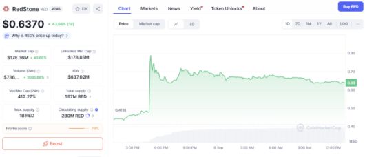 6일 오후 1시 10분 업비트 기준 레드스톤(RED)은 전일 대비 3.97% 내린 895원에 거래됐다. 전날 오후 5시 원화마켓 상장 직후 1600원까지 치솟았던 RED는 하락세로 돌아섰다. 같은 시간 코인마켓캡 기준 RED는 전일 대비 43.68% 오른 0.6370달러를 기록했다. 업비트 상장 공지가 올라온 전날 오후 4시 45분 이후 가격이 급등한 영향이다.