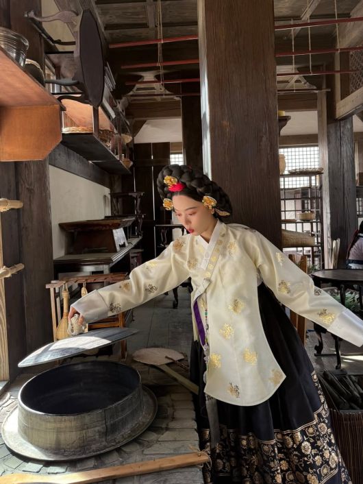 사진에서 강한나는 전통 부엌 한가운데서 큰 가마솥 뚜껑을 들어 올리며 포즈를 취했다. 아이보리빛 저고리에는 섬세한 금박 문양이 수놓였고 검은 치마의 가장자리는 굵은 금사 패턴으로 장식돼 단아함을 살린다.
