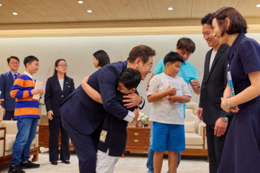 이재명 대통령이 4일 서울 용산 대통령실 청사에서 열린 어린이 초청 행사에 참석해 아이를 안아주고 있다.(사진=연합뉴스) |
