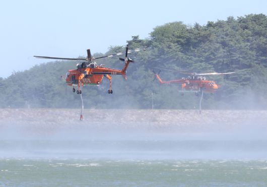 5일 최악의 가뭄 사태가 이어지는 강원 강릉시 장현저수지에서 산불 진화 헬기가 지역 주 상수원인 오봉저수지에 투입할 물을 뜨고 있다. 2025.9.5 [사진=연합뉴스] |