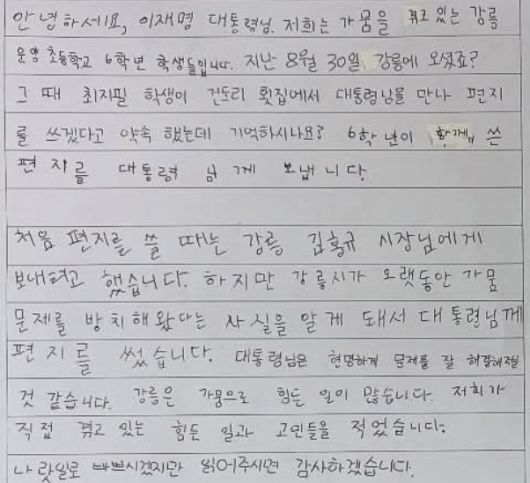 당초 학생들은 김홍규 강릉시장에게 편지를 쓰려고 했으나, 시가 오랜 기간 가뭄 문제를 방치했다고 판단해 이 대통령에게 보낸 것으로 파악됐다. 그러면서 시장과 국회의원이 제때 대처하지 못한 점을 지적하며 “우리에게 투표권이 있다면 이런 식으로 일하는 사람들을 절대 뽑지 않을 것”이라는 취지의 메시지도 담은 것으로 전해졌다. 총 5장으로 이뤄진 편지 마지막에는 “기회가 된다면 우리반 모두 대통령님을 뵙고 싶으니 꼭 초대해달라”는 바람도 적혔다.