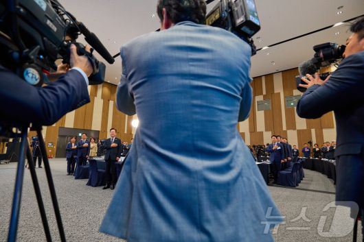 (서울=뉴스1) 이재명 기자 = 이재명 대통령이 지난 5일 인천 송도 컨벤시아 그랜드 볼룸에서 열린 '바이오 혁신 토론회'에서 국민의례를 하고 있다. (이재명 대통령 SNS. 재판매 및 DB 금지) 2025.9.6/뉴스12expulsion@news1.krCopyright ⓒ 뉴스1. All rights reserved. 무단 전재 및 재배포, AI학습 이용 금지.
