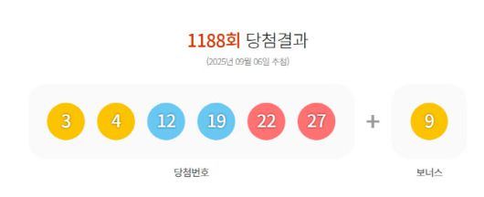 로또복권 운영사 동행복권은 6일 제1188회 로또 추첨 결과 1등 당첨번호가 ‘3·4·12·19·22·27’이라고 밝혔다. 2등 보너스 번호는 ‘9’다.