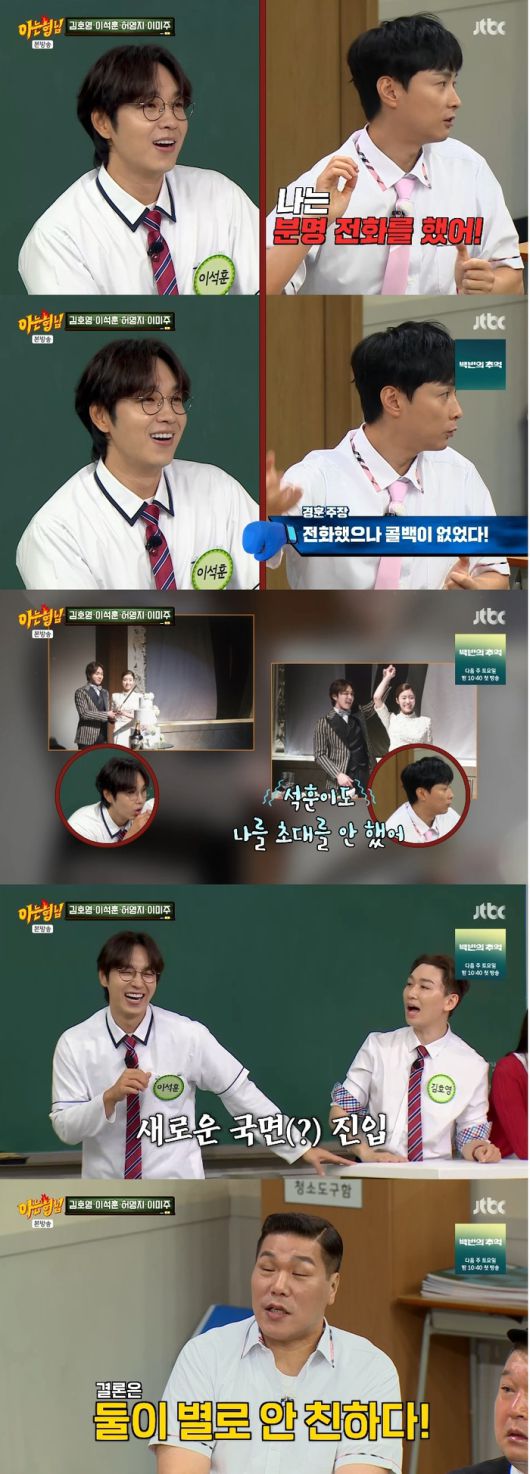 이날 방송에서 서장훈은 이석훈을 보더니 “경훈이의 몇 없는 절친 아냐? 경훈이 결혼식에 왜 안 왔어?”라고 추궁했다. 이에 이석훈은 “나도 의문인 게 얘기를 해줘야 해. 경훈이가 얘기를 잘 안 하는 스타일이야. 근데 결혼식은 기대했지. 근데 연락이 안 온 거야. 테이는 연락받고 간다는 거야. 그래서 ‘나는 얘한테 절친까지는 아닌가 보다’하고 말았어. 그런데 절친 특집이잖아. 작가가 경훈이랑 어떤 사이냐고 묻는데 나도 한번 얘기해봐야겠더라고”라며 서운함을 내비쳤다.