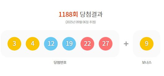 6일 동행복권에 따르면 1188회 로또복권 1등 당첨번호는 ‘3, 4, 12, 19, 22, 27’로 보너스 번호는 ‘9’이다.
