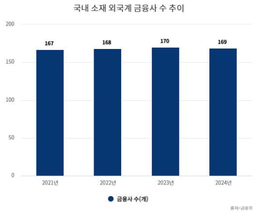 금융산업 경영 환경이 갈수록 위축되면서 외국계 금융사 수는 사실상 정체 상태를 이어가고 있다. 지난해 말 기준 은행을 비롯해 금융투자, 보험, 여신전문, 저축은행 등 외국계 금융회사 수는 169개로 지난 2023년보다 1개 줄었다. 금융투자사가 67개로 가장 많았고 그 뒤로 은행(51개), 보험(26개), 여신전문(17개), 저축은행(8개) 등 순이었다.