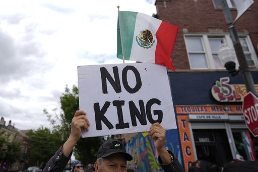 6일(현지시간) 미국 시카고에서 한 주민이 멕시코 국기와 함께 “국왕은 없다”라고 적힌 손팻말을 든 채 도널드 트럼프 대통령을 규탄하고 있다. 오는 16일은 멕시코의 제215주년 독립 기념일이다. AP연합뉴스 |
