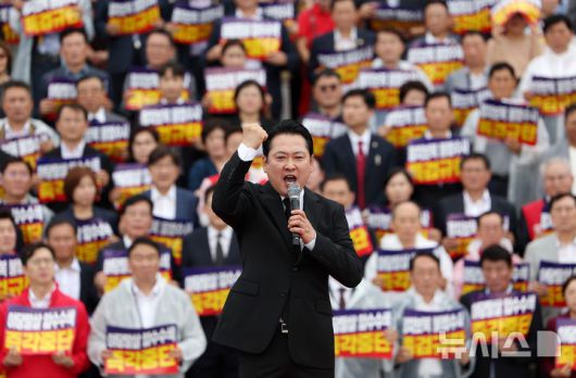 [서울=뉴시스] 김명년 기자 = 장동혁 국민의힘 대표가 4일 오전 서울 여의도 국회 본청 앞 계단에서 열린 '야당말살 정치탄압 특검수사 규탄대회'에서 연설을 하고 있다. 2025.09.04. kmn@newsis.com |