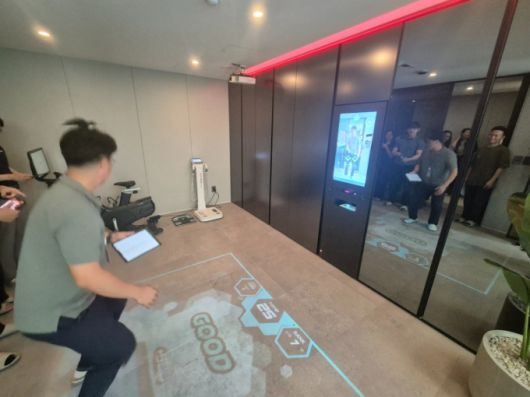 현대건설 관계자가 올라이프케어하우스 내에 있는 '웰니스(Wellness) 솔루션' 중 운동 기능을 직접 시연하고 있다./사진=김평화 기자 |