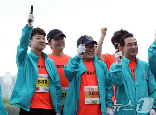 (서울=뉴스1) 박정호 기자 = 이준석 개혁신당 대표가 7일 오전 서울 여의도 한강공원 물빛무대에서 열린 2025 제17회 사이버 영토 수호 마라톤대회에서 박홍근 더불어민주당 의원 등과 함께 하프 코스 출발을 알리고 있다. 2025.9.7/뉴스1pjh2035@news1.krCopyright ⓒ 뉴스1. All rights reserved. 무단 전재 및 재배포, AI학습 이용 금지.