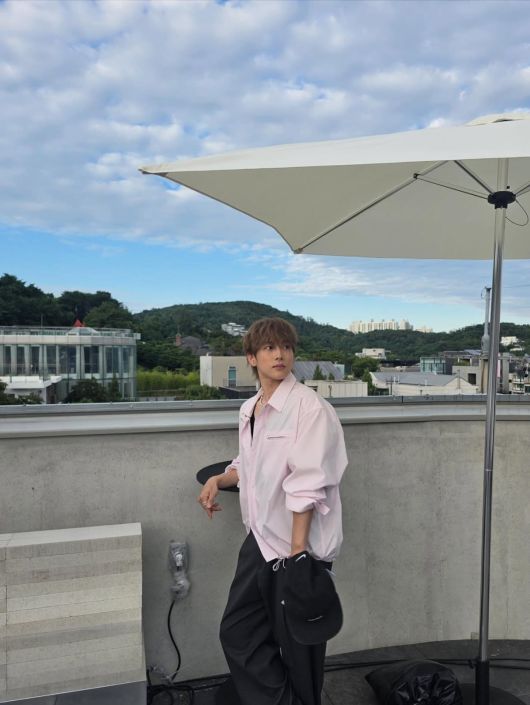 임시완이 옅은 분홍 셔츠와 구름 낀 하늘이 겹쳐 산뜻한 비주얼을 살린 옥상 일상을 선보였따.