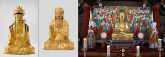왼쪽부터 합천 해인사 금동관음보설좌상·해인사금동지장보살좌상, 창원 성주사 석조지장보살삼존상. 경남도 제공 |