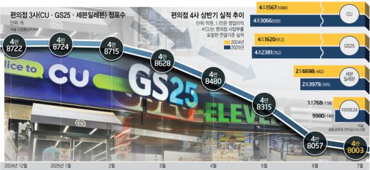 산업통상자원부가 발표한 '2025년 7월 주요 유통업체 매출 동향'에 따르면 편의점 3사(CU·GS25·세븐일레븐) 점포 수는 4만8003개로 지난해 말(4만8722개) 대비 700개 이상 줄어들었다. 지금까지 매월 평균 100개 점포가 정리되고 있다. 특히 지난 4월부터 7월까지 4개월 연속 감소세다.