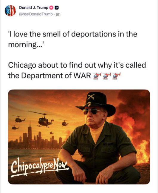 트럼프 대통령은 이날 자신의 소셜미디어(SNS) 트루스소셜을 통해 베트남 전쟁을 소재로 한 영화 ‘지옥의 묵시록’(1979)를 패러디한 이미지를 게재하면서 “시카고는 (전일 행정명령으로 국방부가 명칭을 변경해)‘전쟁부’로 왜 불리는지 알게 될 것”이라는 글을 함께 남겼다. 해당 이미지는 시카고 스카이라인을 배경으로 헬리콥터와 화염을 뒤로한 자신의 합성 사진으로, 그는 “아침에 추방 냄새가 나는 게 좋다”는 대사를 함께 덧붙였다. 구체적인 시기는 언급하지 않았다.