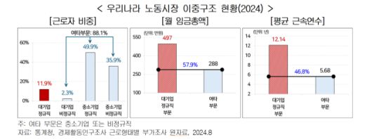 대기업에 비해 중소기업의 임금이 40% 넘게 적었고 근속연수도 절반 이하에 불과하다는 지적이 제기됐다. 정년과 임금을 지속적으로 올린 대기업이 고용은 줄이면서 지난 20년 간 대·중소기업의 임금격차가 더욱 심화되었다는 분석이다. 고용유연성과 사회안전망을 함께 높이는 방식으로 노동시장 이중구조를 해소해야 청년고용 등 사회적 문제를 해결할 수 있다는 조언도 나온다.