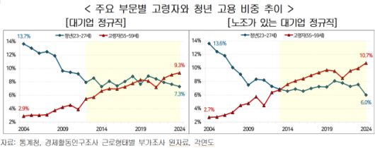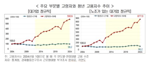 무엇보다 노조가 있는 대기업은 정규직의 고령화가 더 빠르게 진행되고 청년 고용도 위축됐다. 노조가 있는 대기업 정규직 가운데 고령자 고용은 2004년 대비 777.0%나 늘어난 반면 청년 고용은 오히려 1.8% 줄었다. 또 고령자 고용 비중은 2004년 2.7%에서 2024년 10.7%로 8.0%포인트 증가해 청년 고용 비중을 넘어섰다.