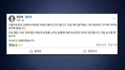 최 위원장은 오늘(7일) 자신의 SNS에, 교육연수원장 직은 지금 자신이 맡기에 너무 중요하고 무거운 자리라고 생각해 왔다며 이같이 적었습니다.