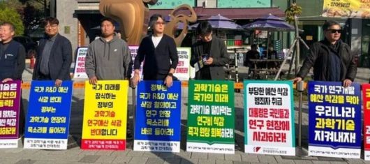 2023년 11월2일 전국공공연구노조와 국가과학기술 바로세우기 과학기술계 연대회의 소속 연구자들이 대전 유성구 한국표준과학연구원에서 열린 ‘대덕연구개발특구 50주년 기념행사’ 행사장 건너편에서 피켓 시위를 벌이고 있다. 이날 행사에는 윤석열 전 대통령이 참석했다. 공공연구노조 제공 |