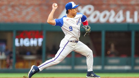 ▲ 애틀랜타 김하성이 7일(한국시간) 미국 조지아주 애틀랜타 트루이스트파크에서 열린 시애틀과 홈 경기에 유격수로 선발 출전해 송구하고 있다.