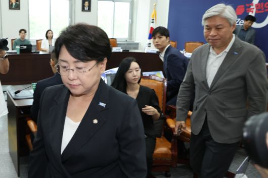 ▲조국혁신당 김선민 당대표 권한대행과 서왕진 원내대표가 7일 서울 여의도 국회에서 당내 성 비위 사건에 대한 책임을 지고 사퇴의사를 밝힌 뒤 회의장에서 나가고 있다. ⓒ연합뉴스 |