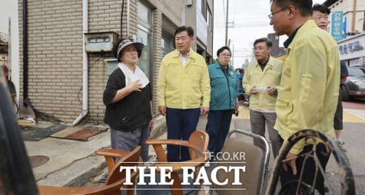 7일 오후 전북 군산시 문화동 집중호우에 따른 침수피해 현장을 찾은 김관영 전북도지사(가운데)가 피해를 호소하고 있는 군산시민들의 현장 목소리를 경청하고 있다. /전북도 |