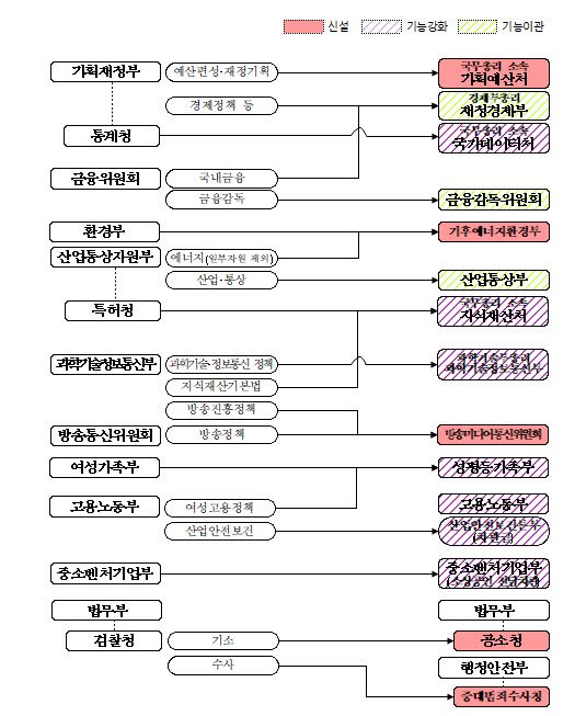 경제부처에선 기재부에서 예산 조직이 총리 산하 기획예산처로 분리된다. 기재부는 금융위원회에서 국내금융 정책을 넘겨받아 국내외 금융을 아우르는 재정경제부로 재편된다. 금융위원회는 금융감독원과 합쳐져 금융감독위원회로 개편, 금융 감독·소비자 보호에 집중한다. 기재부가 출범한 2008년 이전 경제·금융 거버넌스와 유사한 형태다.
