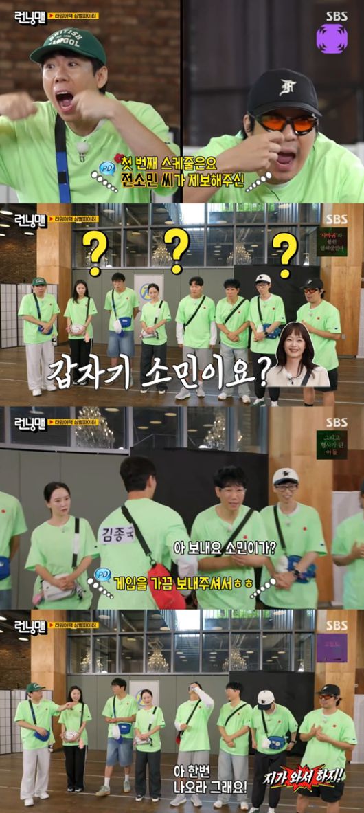 첫 게임을 전 멤버 전소민이 제보했다는 소식에 멤버들은 웅성거렸다. 김종국은 "소민이랑 연락하냐?"라며 놀랐다. 제작진은 "(전소민이) 게임을 가끔 보내준다"라고 고백했다. 유재석은 "자기가 와서 하지"라고 말해 웃음을 자아냈다.
