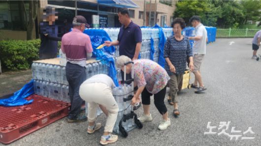 강릉 교동의 한 아파트에서 주민들에게 생수를 배부하고 있는 모습. 전영래 기자 |